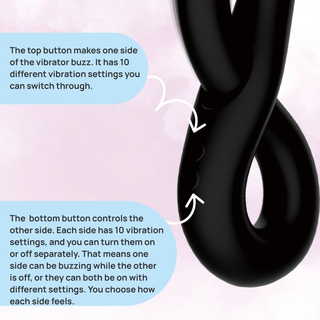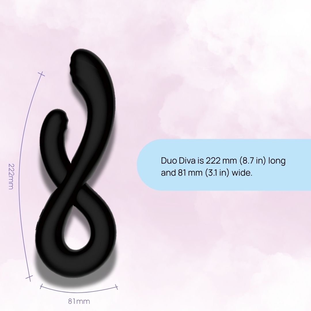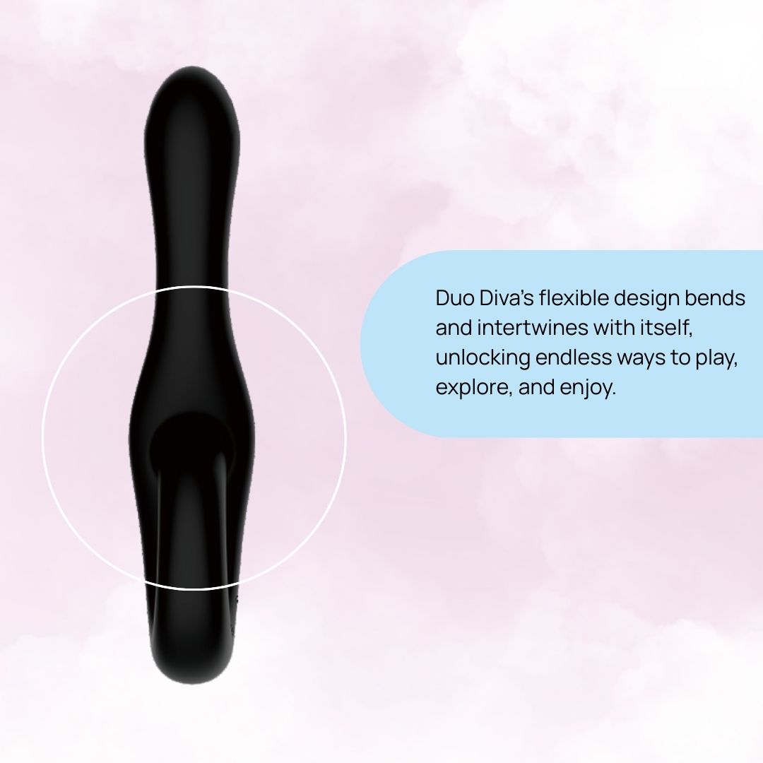 Use DuoDiva as a full-body vibe with one end curved for G-spot stimulation, the other soft and fluttery for clitoral play. Each motor has separate controls, so you can mix and match the magic 🎛️